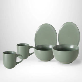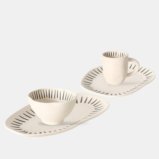 Steinzeug Teller, Tassen und Müslischalen, die perfekt miteinander harmonieren. Das Bild dient als Inspirationsidee – die Produkte können einzeln gekauft und individuell zu einem Set kombiniert werden. Auch in Beige erhältlich.